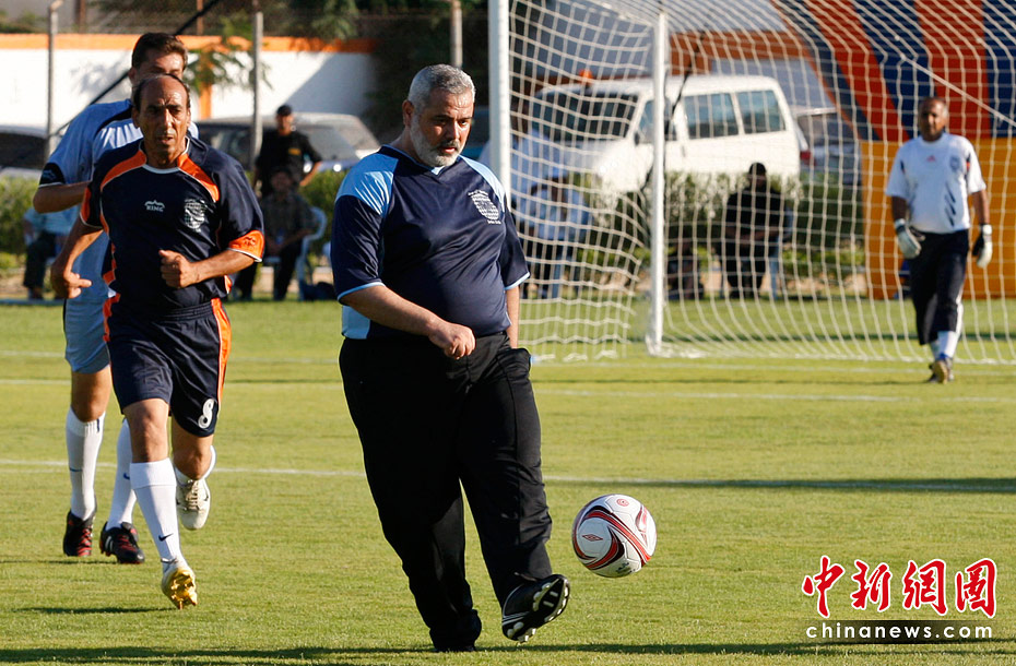 图为2009年8月7日,加沙,巴勒斯坦伊斯兰抵抗运动(哈马斯)领导人哈尼亚在雅穆克体育场重新开放的仪式上大秀足球球技。