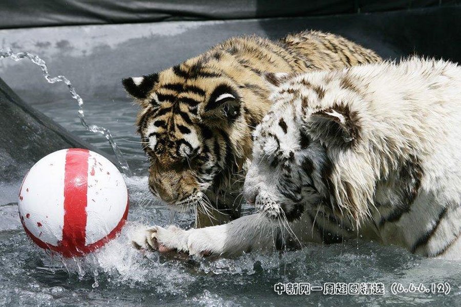 6月7日,美国南卡罗来纳州美特尔海滩,在世界杯即将开幕之际,一岁的小白虎Sundaram和孟加拉虎Mukti率先在水里上演了一出足球大戏。英格兰队首战将对阵美国队,因此足球外侧也被印上了英格兰旗的标志。图片来源:CFP>>点击观看详细内容