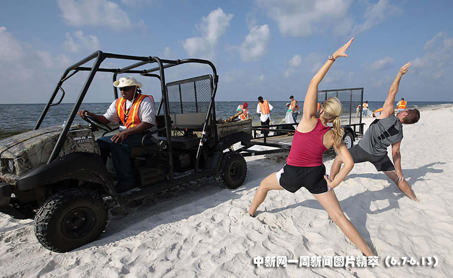 周三(9日)在美国阿拉巴马州奥兰治海滩,英国石油公司(BP)雇佣的清理工在清理焦油球,来自休斯顿的霍利戴(Kristy Holiday)和芬利(Deets Finley)在一旁练习瑜珈。