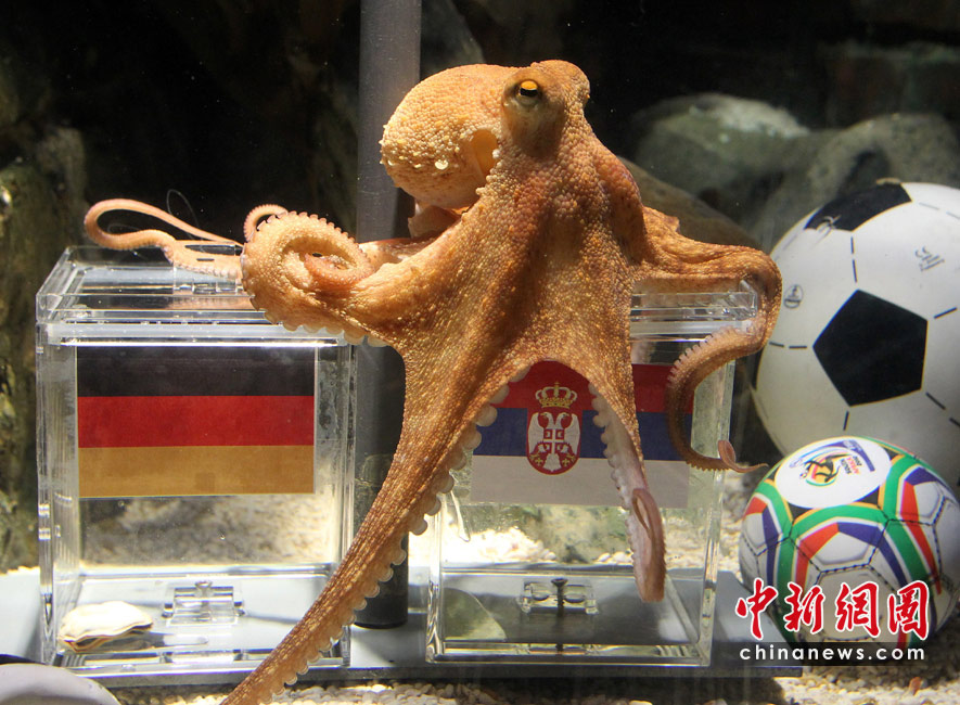 当地时间6月15日,德国北部,水族馆里的海洋生物争抢填满饲料的足球。