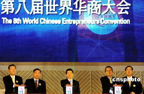 2005年10月10日,韩国总统卢武铉与参会华商代表一起启动第八届世界华商大会开幕按钮中新社发 滕剑峰 摄