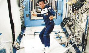日本宇航员若田光一在国际空间站上由日本建造的“希望”号实验舱内试验了毯上飞行以及零重力条件下滴眼药水等。(图片来源:扬子晚报)