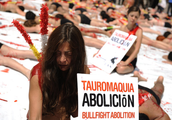 5月24日,西班牙马德里,大批环保人士聚集在凡塔斯斗牛场,他们赤裸上身,并涂上红色涂料,以此抗议斗牛的血腥行为。