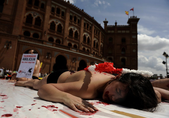 5月24日,西班牙马德里,大批环保人士聚集在凡塔斯斗牛场,他们赤裸上身,并涂上红色涂料,以此抗议斗牛的血腥行为。