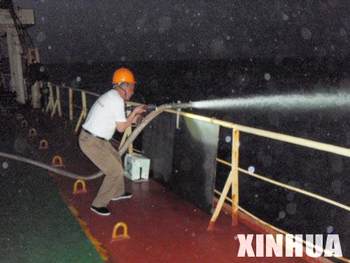 40分钟以后,海盗们看着晶莹海轮实在无懈可击,悄悄离开。晶莹海轮虽然在这场突然的遭遇战中获胜了,但是前面的航程更危险。天也渐渐地黑了下来,船长、政委、轮机长根据从发现海盗快艇到他们登船只需很短的几分钟的特点,研究决定:从现在到和"黄山"舰汇合,全体船员甲板临战状况值守。政委在甲板现场指挥,向全体在甲板值守船员传达了船舶领导班子研究决定,并重新调整了人员,两舷甲板人员定岗定位,不时地用手强光灯和手电向海上搜索,驾驶台也用探照灯搜索船舷两边,保持戒备状况。