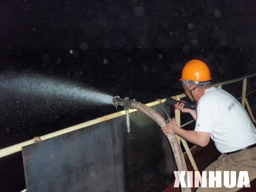 22日上午活动开始前,新华社记者黄书波用高频对船长阚福军、政委汪维圣、大厨赵国志三人进行了采访。