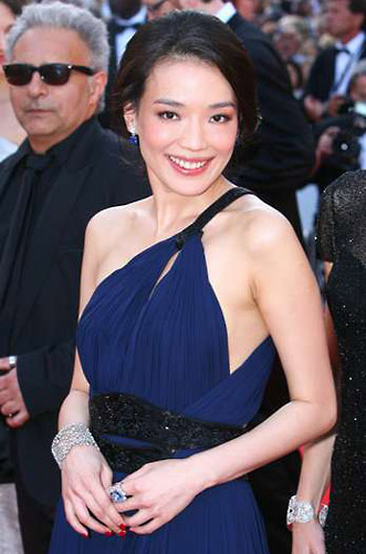 闭幕红地毯秀上,舒淇深蓝色长裙露香肩。