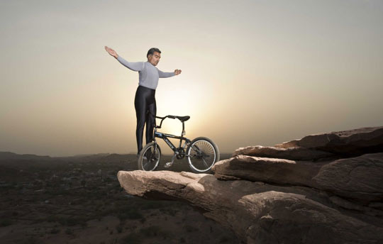 据英国媒体25日报道,印度有一位61岁的奇人名叫Khiv Raj Gurjar,曾在1972年获得了印度自行车赛冠军。从2006年起,他开始在他的自行车上练习瑜伽。如今他可以在自行车上表演很多瑜伽姿势,甚至可以在悬崖边上利用自行车做很多高难度的平衡动作。