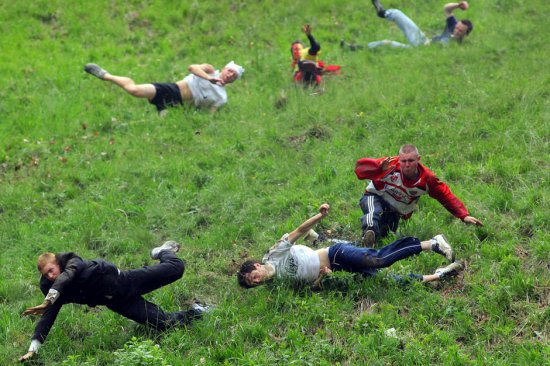 5月26日,在英国格洛斯特郡库珀山举行的滚奶酪比赛上,参赛者奔跑追逐从山坡上滚下的巨型奶酪,最先追到者获胜。一年一度的滚奶酪比赛是英国格洛斯特郡的一项传统赛事,至今已有200多年历史,但由于山坡陡峭光滑,比赛中常有人受伤。
