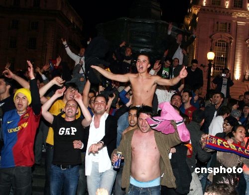 当地时间5月27日,在观看完于罗马举行的欧洲冠军杯决赛电视直播后,巴萨球迷在伦敦皮卡迪利广场庆祝本队战胜曼联夺冠。中新社发 魏群 摄