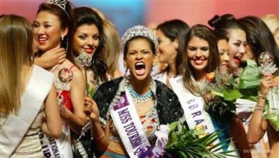 印度小姐Abina Abdul Rashid Khan(中)夺得2004年国际旅游小姐桂冠后高声呐喊。