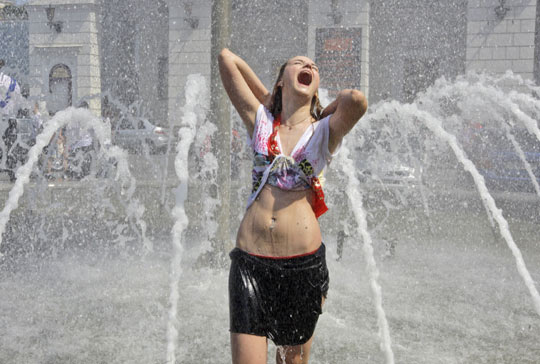 29日,乌克兰基辅的学生在喷泉中玩耍,庆祝学期结束。这是乌克兰学校的一项庆祝活动,约有70万学生参与。