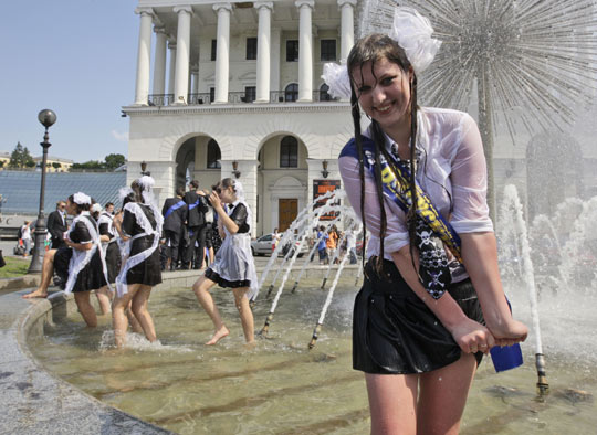 29日,乌克兰基辅的学生在喷泉中玩耍,庆祝学期结束。这是乌克兰学校的一项庆祝活动,约有70万学生参与。