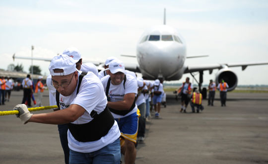 在萨尔瓦多首都圣萨尔瓦多以南40公里处的国际机场,20队选手参加了拖飞机比赛,他们要在5分钟内将一架空客A320飞机拖动25米的距离。