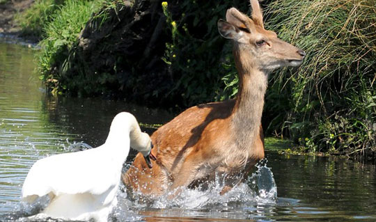 组图:凶悍天鹅公园湖中与小鹿抢地盘(3)