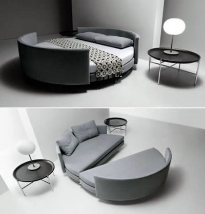 Scoop多功能圆床是由盖多·罗萨迪设计的。两张时尚弧形沙发,合起来就成了一张大圆床,恰当且创造性地解决了沙发具有床功能的需求。而且,这张沙发床无论从色彩材质还是造型剪裁来讲,都很精致细腻,朴素简洁,很是温馨。