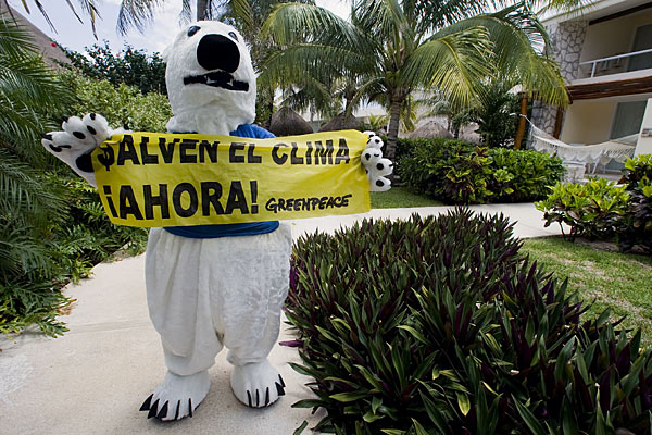 6月4日,在墨西哥绿色和平组织环保主义者扮成北极熊的模样呼吁环保。