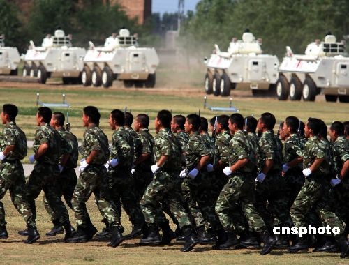驻河北武警某部6月9日下午接受参加首届东盟与中日韩(10+3)武装部队非传统安全论坛代表检阅,并演示训练成果。论坛将围绕“东盟与中日韩武装部队非传统安全交流与合作”主题,就对非传统安全问题的基本知识、东盟与中日韩武装部队共同应对非传统安安全威胁的合作与途径、东盟与中日韩武装部队非传统安安全论坛建设构想等问题进行广泛深入的研究交流。 中新社发 宋吉河 摄