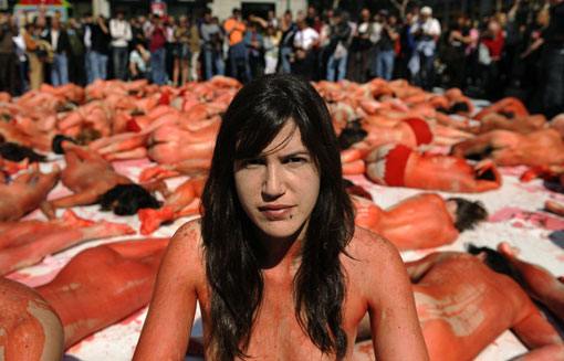 09年3月15日,西班牙马德里,动物保护协会成员身涂人造血,抗议捕猎海豹。