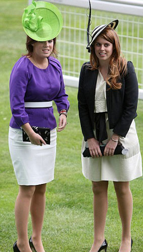 19岁的尤珍妮公主和20岁的比特莱斯公主也齐齐亮相,尤珍妮的绿色大帽子尤为夸张,被媒体称为像头上顶着一粒“大豌豆”。相比之下,比特莱斯公主则低调了很多,黑白色相间的帽子很素气,一根细长的羽毛不露声色。