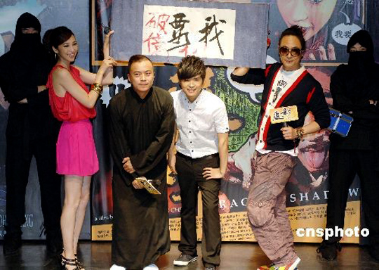 6月30日,吴镇宇执导的喜剧武侠电影《追影》海报及主题曲发布会于北京举行。吴镇宇携美腿吴佩慈现身发布会现场。吴镇宇大展惊人恶搞才能,惹吴佩慈笑得花枝乱颤。《追影》海报上的一句“我要”被吴佩慈反复演绎,其“史上最嗲”的颤音令吴镇宇和党淏瀚都抵挡不住。中新社发 李学仕 摄