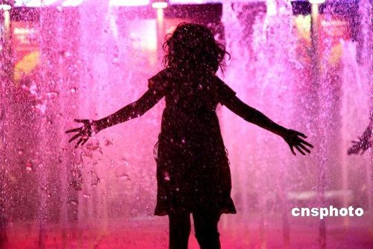 近期北京持续高温,许多市民选择在日落后出行纳凉。北京三里屯一广场上的水景喷泉,吸引众多市民嬉水消暑,孩子们玩得酣畅淋漓。中新社发 赵依依 摄