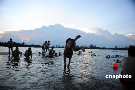 2009年7月1日,海南北部和西部出现37度高温天气,海南琼海市民在万泉河上跳水纳凉。中新社发 蒙钟德 摄