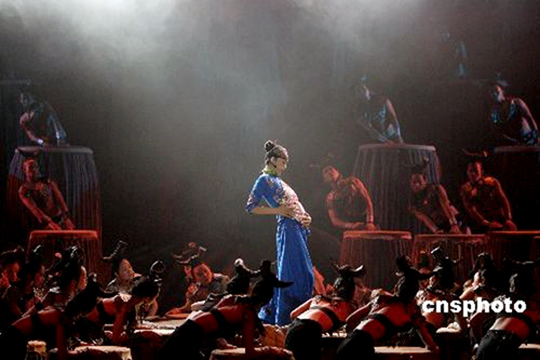 2009年7月2日晚,由知名舞蹈艺术家杨丽萍担纲总导演并领衔主演的大型衍生态打击乐舞《云南的响声》,在北京保利剧院举行专场演出。中新社发 中共云南省委宣传部(供图) 摄