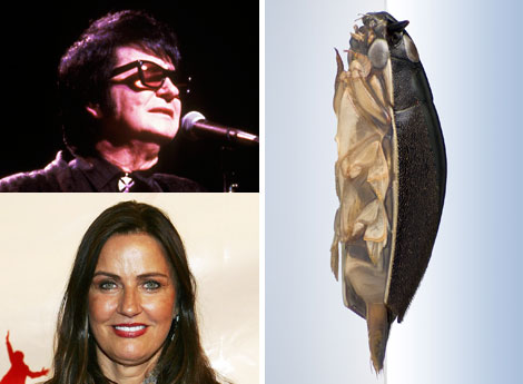 摇滚天王洛伊·奥比森甲壳虫:“奥比森洛拉”属于豉甲科,是一种生活在水面上的甲壳虫。它身长少于5毫米,下腹部呈白色,表皮上面是闪亮的黑壳,外面覆盖着小而密的毛发。