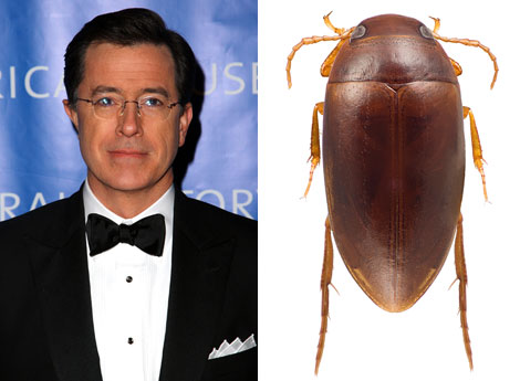 美国喜剧演员斯蒂芬·柯尔伯特甲虫:科学家把新发现的一种学名为Aptostichus stephencolberti 甲虫以他的名字命名。这种雄性新甲虫以生殖能力强而著称,周身长满了纤细茸毛。