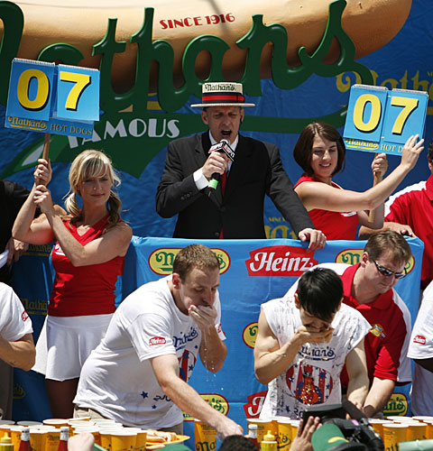 7月4日,美国纽约科尼岛举行一年一度的吃热狗大赛,来自美国加利福尼亚州的“大胃王”乔伊·切斯特纳特以10分钟连吞68个热狗的成绩蝉联冠军。吃热狗大赛是纽约庆祝7月4日美国独立日的传统特色活动之一。