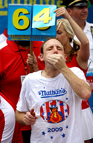 7月4日,美国纽约科尼岛举行一年一度的吃热狗大赛,来自美国加利福尼亚州的“大胃王”乔伊·切斯特纳特以10分钟连吞68个热狗的成绩蝉联冠军。吃热狗大赛是纽约庆祝7月4日美国独立日的传统特色活动之一。