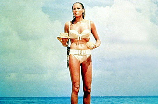 1962年,瑞士演员乌苏拉·安德丝在007系列电影《诺博士》中,身着自制白色比基尼从加勒比海湛蓝海水中出水芙蓉的场面,成了比基尼历史的经典画面。40年后的2001年,这件比基尼拍卖了6万英镑。2002年,《谁与争锋》中哈莉·贝瑞身穿的橙色比基尼创造了比基尼历史上的第二个经典时刻。