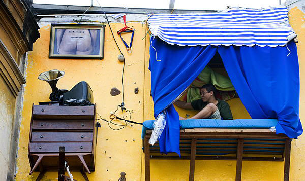当地时间7月10日,在巴西里约热内卢,艺术家加布里埃尔·普里莫躺在墙上的吊床里休息。他不仅楼房的外墙上安装了家具和生活用品,而且从09年5月23日起就生活在这面墙上。以此传达一种新的居住理念。