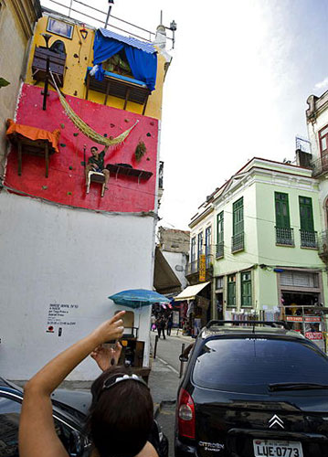 当地时间7月10日,在巴西里约热内卢,艺术家加布里埃尔·普里莫躺在墙上的吊床里休息。他不仅楼房的外墙上安装了家具和生活用品,而且从09年5月23日起就生活在这面墙上。以此传达一种新的居住理念。