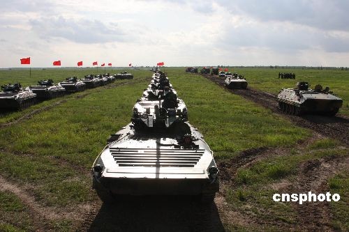7月14日,参加“和平使命-2009”中俄联合反恐军事演习的中俄双方参演部队人员和装备,通过摩托化机动、铁路和空中输送的方式,全部在演习地域集结完毕。中新社发 张雷 摄