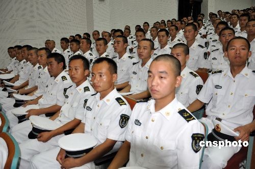 7月15日,中国海军第三批护航编队誓师动员大会在浙江舟山某部隆重举行。经中央军委批准,中国海军第三批护航编队将于7月16日从浙江舟山某军港启程,赴亚丁湾索马里海域接替第二批护航编队遂行任务。即将出征的第三批护航编队由东海舰队的 “舟山”号导弹护卫舰、“徐州”号导弹护卫舰和“千岛湖”号综合补给舰,两架舰载直升机以及海军特战队员组成。中新社发 阿胡 摄