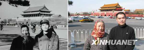 左图为1972年,回家探亲的杨浪与母亲在天安门前留影,那时他是一名解放军战士;右图为2009年,已经是财讯传媒集团常务副总裁的杨浪与母亲再次在天安门前留影。黑明 摄(黑白照片为资料照片)