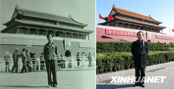 左图为1980年9月28日,17岁的刘增荣初到北京,在天安门前拍下纪念照,当时,刘增荣刚从福建龙岩市上杭县中都镇考入中国人民大学;右图为29年后,在首都经贸大学校报当摄影记者的刘增荣于2009年3月31日在天安门西华表前再次留影,他说:“昔日重现,我仿佛回到了29年前的那一刻!”黑明 摄(黑白照片为资料照片)
