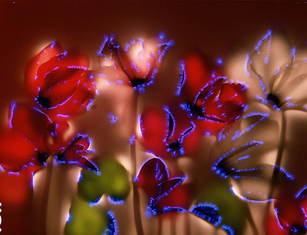 据英国媒体近日报道,美国摄影师伯特-布尔特曼花费10年心血拍摄了令人惊异的植物通电照片。这些照片是电流穿过金属板,而金属板顶部放置着植物,在这种条件下拍摄植物通电的情景。