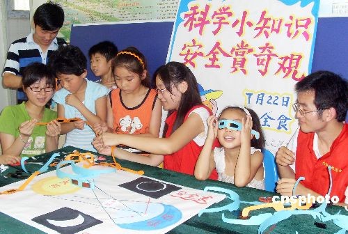 7月13日,江苏大学的学生在指导镇江市杨家门社区小朋友制作观看日全食的“眼镜”。当日,江苏大学人文学院的大学生来到镇江市金山街道杨家门社区,向社区小朋友宣讲与日全食相关的天文知识,指导小朋友制作观看日全食时用以保护眼睛的“眼镜”。中新社发 石玉成 摄
