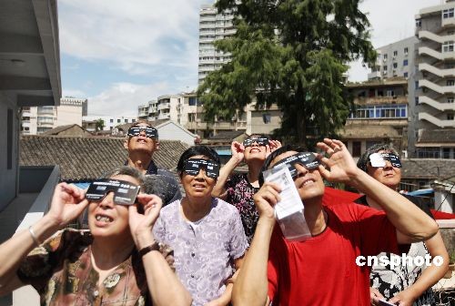 2009年7月13日,浙江省舟山市定海区环南街道海滨社区特意为辖区近百位60岁以上爱好天文的老人免费配戴太阳观察眼镜,以方便他们预先试用太阳观察眼镜,只待时日一到好好感受罕见的天文奇观。中新社发 胡社友 摄