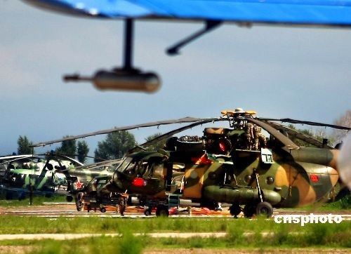 参加“和平使命2009”联合反恐军事演习的中国军队陆军航空兵部队,7月20日官兵们在认真检测即将参加演习的直升机群,以确保在演习中万无一失。这支部队在演习中担负着地面攻击配合、投送兵力、医疗救护等任务。这次演习,双方以陆军和空军为主,中方参演部队包括1个陆军战斗群和1个空军战斗群,俄方参演兵力包括1个陆军加强摩步营、1个空降突击连和部分空军兵力。中新社发 宋吉河 摄