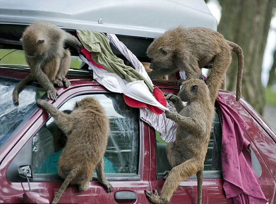 据英国媒体21日报道,英国诺斯雷野生动物园的游客已经接到警告,因为这里出现了一群会“洗劫”你车顶旅行箱的“强盗狒狒”。它们对箱子内的东西都很好奇,包括衣服、鞋子甚至内衣都是这些狒狒的“寻宝”对象。