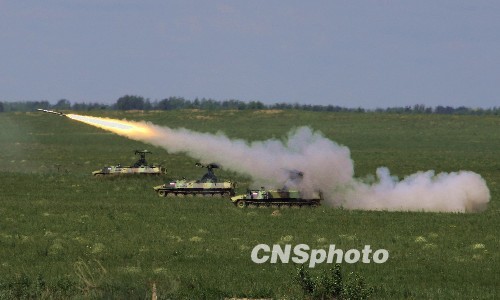 7月21日,参加“和平使命—2009”联合反恐军事演习的俄方参演部队进行分练,中方参演部队予以配合。在80分钟的分练中,进行了 “联合封控、立体突破、机动歼敌、纵深围剿”等内容达到了预期的效果。俄方加强步兵营、空降兵突击连和参演的俄空军各种战机参加了分练。图为俄陆军发射箭-10防空导弹。 中新社发 张雷 摄