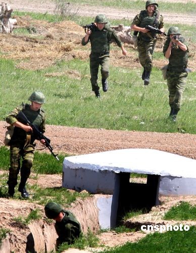 7月21日,参加“和平使命—2009”联合反恐军事演习的俄方参演部队进行分练,中方参演部队予以配合。在80分钟的分练中,进行了 “联合封控、立体突破、机动歼敌、纵深围剿”等内容达到了预期的效果。俄方加强步兵营、空降兵突击连和参演的俄空军各种战机参加了分练。中新社发 宋吉河 摄