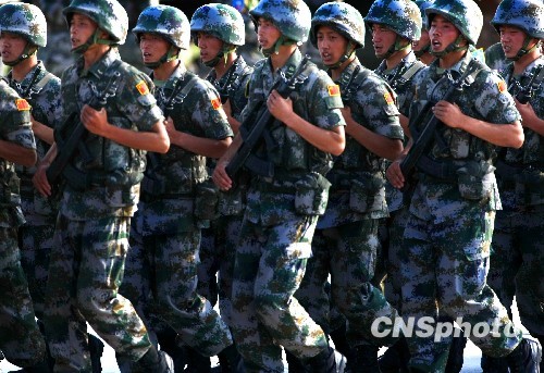 “和平使命2009”联合反恐军事演习将于7月26日上午进入实兵实弹演习高潮,下午举行阅兵仪式。目前参加演习的解放军官兵在阅兵地点熟悉现场。中新社发 宋吉河 摄