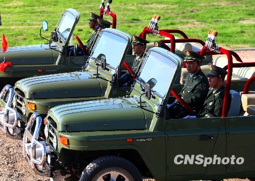 “和平使命2009”联合反恐军事演习将于7月26日上午进入实兵实弹演习高潮,下午举行阅兵仪式。目前参加演习的解放军官兵在阅兵地点熟悉现场。中新社发 宋吉河 摄 图为阅兵车。