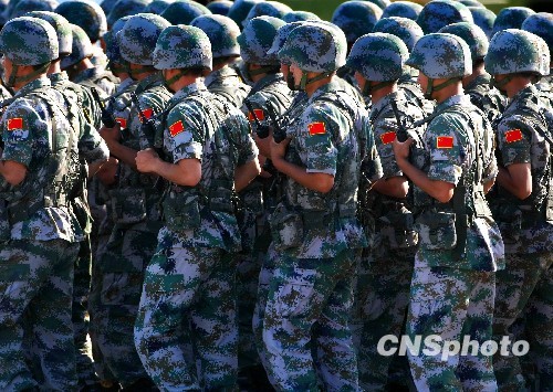 “和平使命2009”联合反恐军事演习将于7月26日上午进入实兵实弹演习高潮,下午举行阅兵仪式。目前中俄两军参加演习的官兵在阅兵地点熟悉现场。中新社发 宋吉河 摄