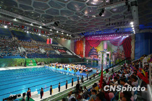 7月27日晚,2009年中俄青少年运动会在北京国家游泳中心“水立方”开幕。本次赛事为期5天,共将进行摔跤、射击、跳水、花样游泳、体操、武术等9个大项、62个小项的比赛。中国和俄罗斯代表团各派出88名青少年运动员参赛。中新社发 富田 摄